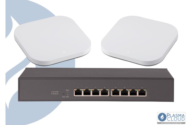 This bundle is a single Plasma Cloud PSX8 Multi-Gig PoE switch and two of the latest PAX1800-Lite WiFi 6 access points, a great bundle for covering smaller buildings or sites with higher density and throughput requirements.
